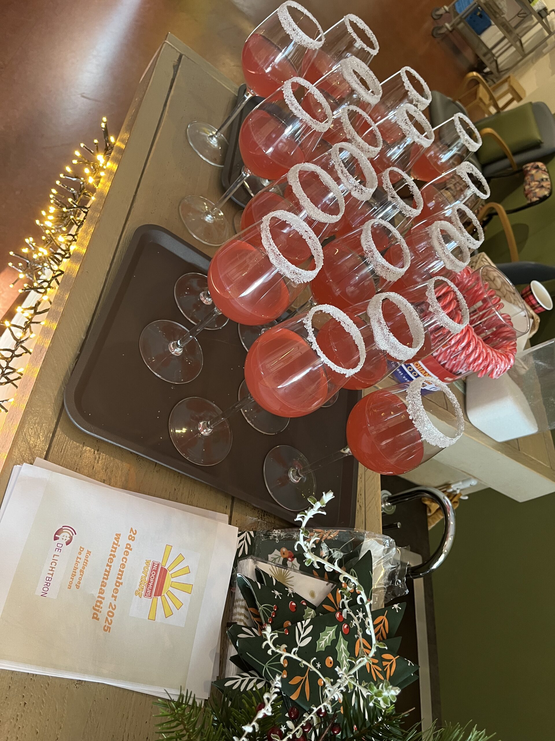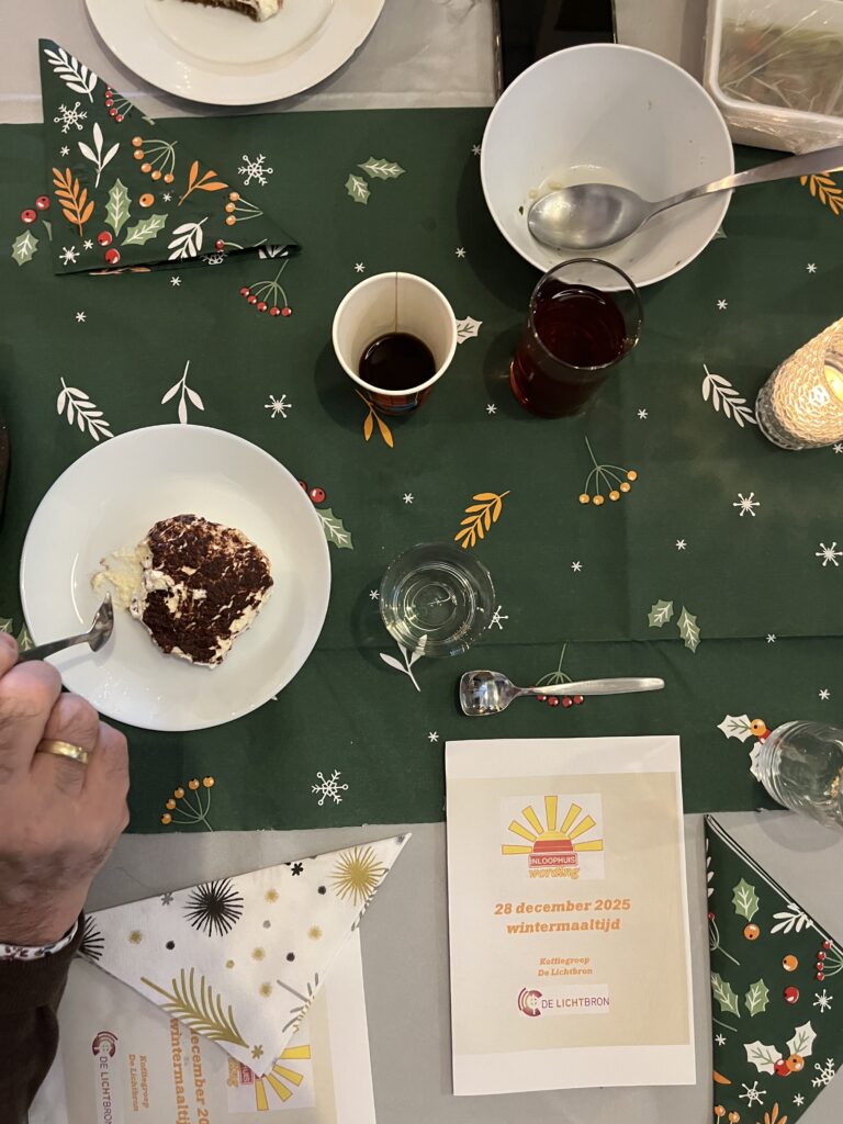 Zondag 28 december organiseerden enkele gemeenteleden van De Lichtbron een voedzaam winterdiner voor de gasten van inloophuis Wording, een inloophuis voor dak- en thuisloze en eenzame medemensen. Op deze 4de Kerstdag mochten we tussen 12 en 15 uur aan ongeveer twintig gasten een heerlijk kerstdiner serveren.